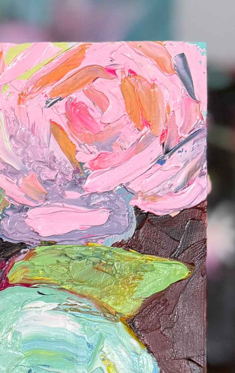 Each piece in the Inner Glow Collection started with random dots of color, then, instead of using photo references, I followed my gut and let the blooms emerge through strokes of palette knife painting.